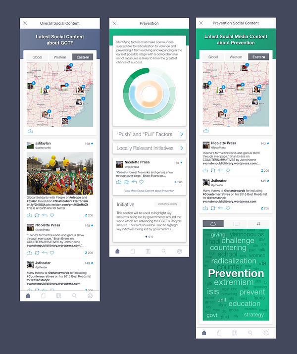 We integrated social media analytics visual into the app using data visualization provided by Zoomph, a social media analytics company. Here are a few screens demonstrating how we integrated those analytics visuals. these visuals help community building and show the trendy topics about counter terrorisms around the world.